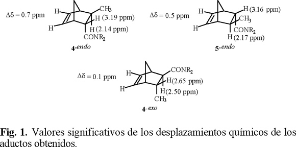 La estereoquímica endo o exo de los aductos pudo ser facilmente establecida a partir de sus datos de 1H-RMN, especialmente el de los desplazamientos químicos de los protones olefínicos. A partir de los datos correspondientes a compuestos norbornénicos referibles [12] ha podido establecerse que la diferencia de desplazamiento entre los dos protones olefínicos de los aductos endo es sustancialmente mayor que la que existe en los exo (Δδendo > Δδexo). También resultan significativos los desplazamientos de los protones H-2 y H-3, que presentan valores más altos cuando ocupan una disposición pseudoecuatorial. En nuestro caso, Δδ entre los protones olefínicos es de 0.7 ppm y 0.5 ppm, respectivamente, para los aductos 4-endo y 5-endo, disminuyendo hasta 0.1 ppm en el caso del aducto 4-exo (Fig. 1). Por otra parte, el desplazamiento de H-2 en los aductos 4-endo y 5-endo es de 3.19 ppm y 3.16 ppm, respectivamente, disminuyendo su valor hasta 2.5 ppm en el caso del aducto 4-exo. Los valores de δ-H3 concuerdan también con este criterio, siendo menores para los aductos 4-endo y 5-endo (2.14 ppm y 2.17 ppm respectivamente) que para el 4-exo (2.65 ppm).