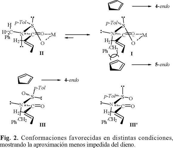 En ausencia de metales, la conformación s-cis preferida por la amida dispondría también al grupo N-bencilo en una orientación similar, con el fin de evitar las interacciones con H-2 (III en la Fig. 2), por lo que resulta previsible observar un predominio del aducto resultante de la aproximación del dieno desde la cara superior de III (conformación que minimiza las interacciones electrostáticas), que es idéntico al que se obtiene en presencia de los catalizadores, tal y como indican los resultados experimentales. En medios acuosos, la conformación más polar, III', con los enlaces C=O y S=O paralelos, debe estar favorecida, lo que refuerza la preferencia axial del grupo N-bencilo y, por tanto, la estereoselectividad de la reacción (en estos medios es la más elevada). Según puede observarse, las prediciones de este modelo estereoquímico proporcionan un soporte adicional a la asignación tentativa que realizamos del compuesto 4-endo.