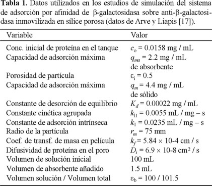 En este trabajo se seleccionó como sistema modelo la adsorción por afinidad de β-galactosidasa sobre anti-β-galactosidasa inmovilizada en una matriz de sílice porosa y los valores de los parámetros reportados para este sistema por Arve y Liapis [17]. Los datos utilizados para conducir los estudios de simulación se presentan en la Tabla 1.