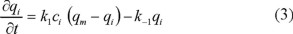 donde: qm es la capacidad máxima de adsorción del adsorbente; k1 y k-1 son las constantes cinéticas de adsorción y desorción, respectivamente.