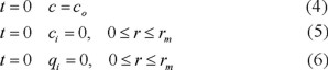 El modelo de afinidad por lotes utilizado en esta investigación, se basa en la adsorción isotérmica de una proteína sobre partículas esféricas de adsorbente de radio promedio, rm, y porosidad, εi. La operación se supone se conduce en un tanque bien agitado con un volumen de sistema V. El volumen de líquido externo a la matriz de adsorbente es εbV y el volumen de adsorbente es (1 - εb)V. La concentración inicial y transiente de proteína en el seno del líquido son co y c(t), respectivamente. La concentración de proteína en el líquido de los poros y en la superficie del adsorbente son ci y qi, respectivamente.