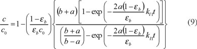 El modelo de parámetros agrupados [16, 24] utiliza un enfoque empírico sencillo para describir el proceso de adsorción, donde se supone que todos los procesos que limitan la velocidad de adsorción del soluto pueden ser representados por constantes cinéticas. En este enfoque, la velocidad de transferencia de masa de soluto al adsorbente se supone que es descrita por la Ec. (3). En un proceso de adsorción por afinidad en un tanque bien agitado, la concentración de soluto en solución a un cierto tiempo está dada por la siguiente solución analítica del modelo: