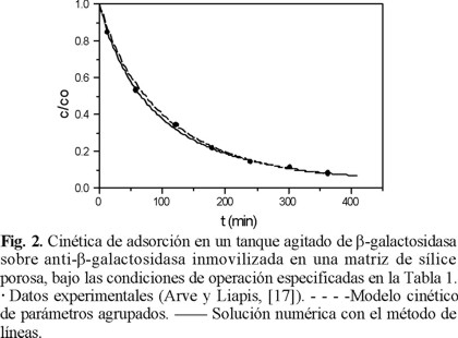 La solución del modelo de transporte para la adsorción por afinidad en un tanque perfectamente agitado, de β-galactosidasa sobre anti-β-galactosidasa inmovilizada en una matriz de sílice porosa, fue obtenida utilizando el método numérico de líneas. Esta solución fue comparada con la solución analítica del modelo de parámetros agrupados y con datos experimentales. Estos resultados se muestran en la figura 2 donde se grafica la concentración adimensional de β-galactosidasa en el seno del líquido, c / co, contra el tiempo del proceso de adsorción, t. Las corridas simuladas, tanto con la solución NUMOL como con la del modelo de parámetros agrupados, se ajustan bien a los datos experimentales, con una ligera ventaja del primer método.