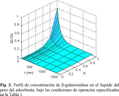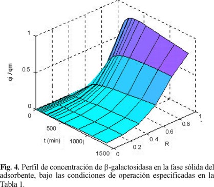 Los perfiles de concentración adimensional de β-galactosidasa en el líquido del poro, ci / co y en la fase sólida, qi / qm, obtenidos mediante la simulación con NUMOL, se muestran en las Figuras 3 y 4, respectivamente. En estas figuras la concentración se grafica como función del radio de partícula adimensional, R = r / rm y el tiempo de adsorción, t.