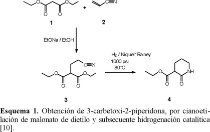 La obtención de la 3-carbetoxi-2-piperidona (4), necesaria para la síntesis de 6-amino- (9) y 6-acetamido-1,2,3,4-tetrahidro-1-oxo-β-carbolina (12), se realizó por cianoetilación de malonato de dietilo (1) con acrilonitrilo (2), seguida de hidrogenación catalítica, de acuerdo con la técnica descrita por Albertson y Fillman [11] (Esquema 1), y optimizada por Haro y col. [10].