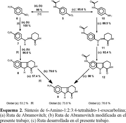 Para comparar los rendimientos globales de ambas rutas de síntesis, la de Abramovitch y la realizada por nosotros en la obtención de 6-amino-1,2,3,4-tetrahidro-1-oxo-β-carbolina (9) (Esquema 2), consideramos necesario tomar en cuenta el rendimiento de hidrólisis de la p-nitroacetanilida (5) (materia prima en nuestra vía de síntesis), para obtener p-nitroanilina (6) (materia prima en la vía de síntesis de Abramovitch y Shapiro). El rendimiento informado es de 96 % [12].