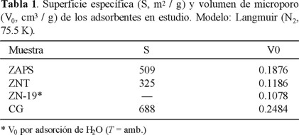 De lo anterior se deduce que las tres zeolitas naturales presentan una alta capacidad de adsorción del CO2, aunque considerablemente más alta para ZAPS, que para las otras dos, conservándose esta propiedad a presiones bajas o grados de cobertura pequeños; se observa, además, que las capacidades de adsorción de ZNT y ZN-19 son muy parecidas, es decir, la capacidad que presentan las zeolitas de adsorber CO2, en todo el intervalo de presiones de equilibrio estudiado, disminuye en el orden (ZAPS) > (ZNT) ≈ (ZN-19). A diferencia de las zeolitas, la superficie del carbón activado es prácticamente no polar, provocando que su capacidad de adsorber CO2 sea inferior a la de las zeolitas, especialmente a bajas presiones de equilibrio, a pesar de que el carbón activado CG también es un adsorbente microporoso y con una superficie específica y volumen de microporo superiores a los de las zeolitas (Tabla 1).