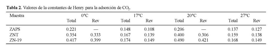 En la Tabla 2 se presentan los valores de la constante de Henry, calculados a partir de las isotermas de adsorción de CO2 mediante la ecuación o isoterma de Henry a bajos grados de cobertura. Cabe mencionar que la muestra ZN-19 presenta el mayor valor en la constante de Henry para la adsorción total a 0 y 20 °C, lo que confirma que es esta muestra la que presenta mayores interacciones adsorbato-adsorbente, tal como se puso de manifiesto al estudiar la adsorción irreversible y es por tanto la que presenta una mayor disminución en el calor isostérico de adsorción a bajas presiones de equilibrio (Fig. 4).
