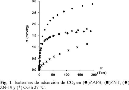 En este trabajo no se incluyen las isotermas de adsorción de CO2 a 17 °C de las tres muestras zeolíticas naturales, ya que éstas han sido reportadas en un trabajo anterior [7]. En la Fig. 1 se presentan las isotermas de adsorción de CO2 a 27 °C. Con fines de comparación en esta figura se incluye también la isoterma de adsorción en carbón activado CG. Se observa que las isotermas de adsorción para las tres muestras zeolíticas aumentan bruscamente a bajas presiones de equilibrio, lo cual podría obedecer a dos factores: a) las moléculas de CO2 penetran libremente, es decir, sin dificultades estéricas, a través de las ventanas de entrada hacia los microporos; y b) el CO2 interacciona específicamente con determinados centros de adsorción presentes en la estructura microporosa de las zeolitas.