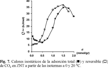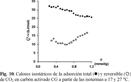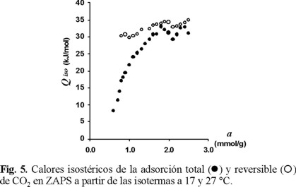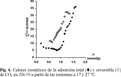 En la Fig. 10 se presenta el calor isostérico de adsorción total y reversible de CO2 en CG en función de la cantidad de sustancia adsorbida. A diferencia de lo observado para las zeolitas, el calor isostérico de la adsorción reversible adquiere valores inferiores a los de la adsorción total. Es evidente que la superficie del carbón es más homogénea energéticamente que la de las zeolitas, ya que el calor isostérico de la adsorción total en CG no presenta extremos de la función Qiso= f(a), observándose una leve y paulatina disminución al aumentar la cantidad de sustancia absorbida. Por otro lado, el hecho de que los valores de los calores isostéricos de la adsorción reversible sean menores que los de la adsorción total puede obedecer a que la concentración superficial de centros de adsorción es muy baja en comparación con la de las zeolitas. El calor isostérico de la adsorción reversible permanece prácticamente constante al inicio y, al aumentar la cantidad de sustancia adsorbida aparece un aumento por las interacciones adsorbato-adsorbato, pero este aumento no es tan brusco como en el caso de las zeolitas.