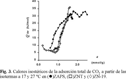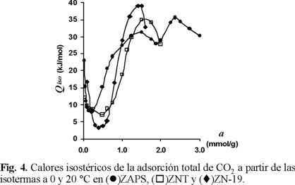 Por otro lado, el hecho de que el calor isostérico de adsorción (Fig. 3) en ZN-19 permanezca prácticamente invariable en la región de 0.3 a 1.0 mmol / g, probablemente esté obedeciendo a la ocupación, en esa región, de centros de adsorción de bajo potencial de adsorción; probablemente ya se hayan ocupado para a < 0.3 mmol / g los centros de adsorción más activos. Este razonamiento puede estar soportado por el hecho de que precisamente ZN-19 es la que presenta mayor proporción de adsorción irreversible. Desafortunadamente, para valores de a < 0.3 mmol / g, que corresponden a la adsorción irreversible en las tres muestras y, por lo tanto, donde se debería haber observado una disminución drástica del calor de adsorción, este no se pudo evaluar con una exactitud aceptable.