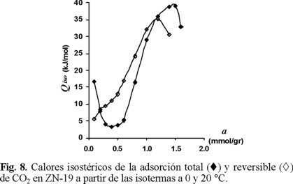 En las Figs. 7 y 8 se muestran los resultados obtenidos a 0 y 20 °C para la mordenita y clinoptilolita, respectivamente. En ninguna de las dos muestras se observa la disminución inicial del calor isostérico de la adsorción reversible, como es el caso de la adsorción total, debido a que en esta última predominan las interacciones adsorbente-adsorbato, mientras que en la adsorción reversible no pueden participar los centros de adsorción más activos, ya que éstos se encuentran ocupados previamente por las moléculas adsorbidas irreversiblemente; este hecho se pone de manifiesto con la disminución de los valores de la constante de Henry para la adsorción reversible de CO2 a 0 y 20 °C en estas muestras, con respecto a la adsorción total (Tabla 2).