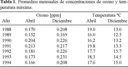 Para establecer el programa experimental se analizó el comportamiento del ozono y la temperatura a través de los años para los meses de abril y diciembre a partir de los datos de la red automática de monitoreo de la Ciudad de México. De donde se obtuvo la tabla 1 que muestra la estadística descriptiva mensual de la concentracion promedio de ozono (ppm) y la temperatura máximas diarias [10] en las estaciones Tlanepantla, Xalostoc, Merced, Pedregal y Cerro de la Estrella. De la cual se observa un marcado contraste en las mediciones de temperatura durante abril y diciembre. En general las temperaturas de abril son mayores en comparación con diciembre. De modo que esta variable sirvió de base para el diseño de experimentos el cual consistió en determinar el número de días mínimos a experimentar durante abril y diciembre. Los días del mes de referencia tomado fue de 31 días y para un intervalo de confianza del 95 % se encontró que mínimo 12 días eran suficientes para el estudio.