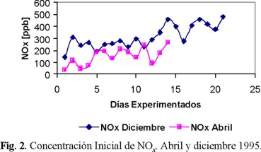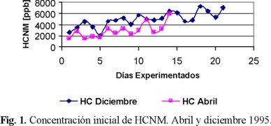 Las Figs. 1 y 2 muestran las diferentes concentraciones iniciales de los hidrocarburos no metánicos (HCNM) y NOx que resultaron durante los dos experimentos. Estas diferencias se deben a las condiciones meteorológicas que prevalecen en ambos meses del año. Ya que abril se caracteriza por una alta dispersión de los contaminantes como consecuencia de una mayor velocidad de los vientos que imperan en ese mes y sucede lo contrario en diciembre. De manera que tanto las concentraciones de los HCNM y de NOx son mayores en diciembre con respecto al mes de abril.