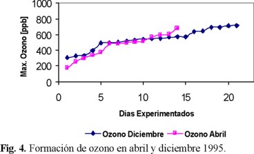 Con la finalidad de comparar los máximos de ozono encontrados durante los días de ambos meses se ordenaron de menor a mayor valor. Los cuales en general resultaron como consecuencia de la magnitud de las concentraciones iniciales de los COV'S y NOx en el aire ambiente matutino y de la irradiación solar que incidió durante las pruebas en cada mes del año.
