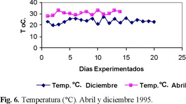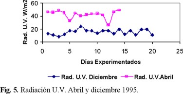 En cuanto a la radiación solar la diferencia se marcó con mayor amplitud. En abril se presentó en promedio una radiación alrededor de 40 watts / m2, mientras que en diciembre cae hasta aproximadamente 15 watts / m2, según la Fig. 5. Este comportamiento también se presentó con la temperatura, véase Fig. 6.