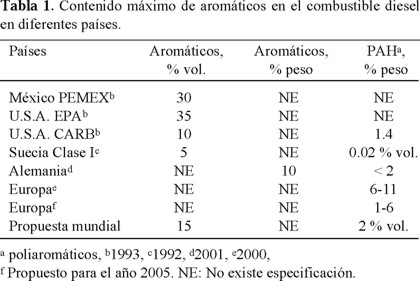 Una propiedad importante, a la cual no se le ha puesto suficiente interés en el desarrollo de correlaciones, es la concentración de aromáticos. Esta propiedad, en conjunto con otras como son el número de cetano, la concentración de azufre, el intervalo de ebullición, etc., se utilizan básicamente para evaluar la calidad del combustible diesel. Cabe destacar que la tendencia mundial exige restricciones ambientales más estrictas para este combustible, en donde se han establecido valores máximos para el contenido de aromáticos (Tabla 1) [7, 8, 9].
