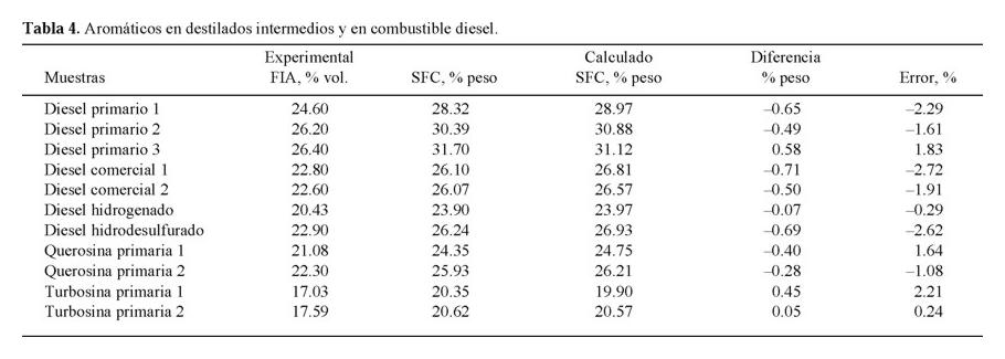 Para confirmar la aplicabilidad de la correlación, se analizaron otros destilados intermedios vírgenes e hidrotratados, con un intervalo de color ASTM entre 0.5 y 2.0, cuyas concentraciones de aromáticos (FIA y SFC) se presentan en la Tabla 4.