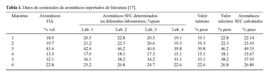 Existen algunos reportes en la literatura sobre resultados de concentración de aromáticos obtenidos con los métodos FIA y SFC para turbosinas y combustibles diesel provenientes de crudos canadienses, los cuales se resumen en la Tabla 5 [17]. El análisis de aromáticos de cada muestra por el método FIA se determinó una sola vez, mientras que el contenido de aromáticos por el método SFC se realizó en cuatro laboratorios diferentes. De esta tabla se observa que los valores de aromáticos por SFC varían para cada laboratorio presentando diferencias entre 3 y 6.4 % peso.