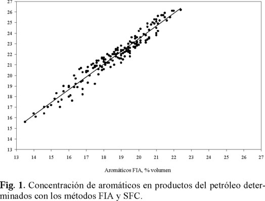 Las concentraciones de aromáticos en las fracciones del petróleo determinadas por ambos métodos se presentan en la Fig. 1. El intervalo de concentración de aromáticos, medido con el método FIA, es de 13.5 a 22.5 % vol., mientras que con el método SFC el intervalo varía entre 15.5 y 26.5 % peso [15].
