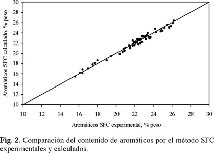 La correlación desarrollada presenta una buena estimación del contenido de aromáticos por el método SFC, a partir de datos experimentales obtenidos por el método FIA, como se muestra en la Fig. 2. El error promedio encontrado fue de 2.3 %, obteniéndose una diferencia máxima absoluta de 1.0 % peso.