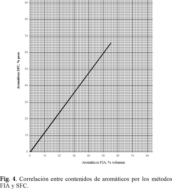 Para facilitar los cálculos, en la Fig. 4 se presenta esta correlación de manera gráfica con la que se pueden determinar directamente las concentraciones de aromáticos por los métodos FIA y SFC, conociendo una de las dos.