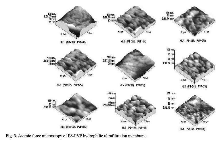 The basic characteristics of PS / PVP membranes like water content, A-value, molecular weight cut-off, surface hydrophilicity, and surface roughness can be altered by addition of the desired polymer in the membrane casting solutions. For most ultrafiltration applications, the membrane is required to have a smaller molecular weight cut-off with narrow pore size distribution and highly hydrophilic surface. We believe that some of our membranes prepared in this investigation may find applications in the field of wastewater treatment processes like oil-water separation that requires membranes with highly hydrophilic surfaces.