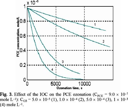 In Fig. 2b curve 3 corresponds to an ozone concentration 5 × 10−4 mole L−1 while curve 4 does to 1 × 10−3 mole L−1. The difference in the removal time for TCE is 2000 s, approximately.