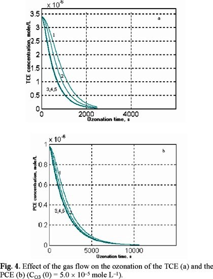 In the latter case, radicals are produced through the ozone molecule decomposition catalyzed by the hydroxyl ion. In the studied case, the radical route of degradation of TCE and PCE may be neglected and these substances are decomposed by direct reaction by ozone. The radical mechanism of the ozonation was not analyzed, neither the auto-decomposition of the ozone in water was considered within the proposed mathematical model. The measurement and comparison of the ozone concentration in the gas phase in the inlet and the outlet of the reactor let us confirm that the auto-decomposition of ozone was not, practically, observed.