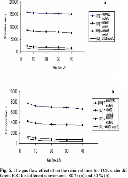 The removal times of TCE (80 %) for different gas flow and for different initial ozone concentration also were simulated. As it can be observed from Fig. 5a, the ozone flow is not a "strong" parameter for the removal time at the same IOC. The IOC is seen to have a larger effect on the TCE destruction. The gas flow is a variable that, barely intervenes to high conversion (80 %) (see Fig. 5a). A small influence of the gas flow for less conversion of 50 % can be detected.
