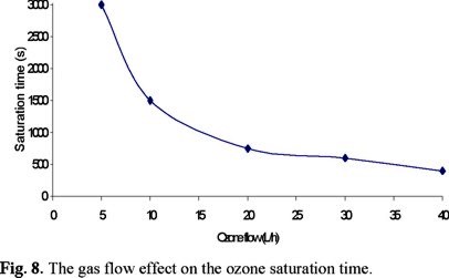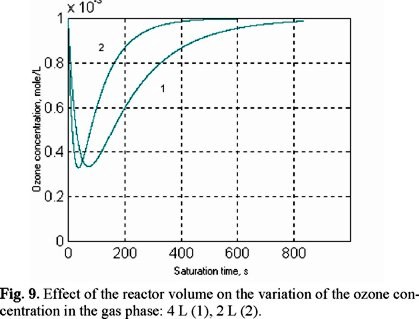 The simulation shows also that the gas flow effect, both on the ozone saturation in water and on the ozone concentration variation in the gas phase in the reactor outlet, is very significant (Figs. 6 and 7).