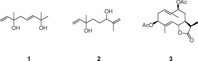 Aerial parts of A. falcata L. (syns. A. damascene DC, A. sulfurea Boiss.) were extracted at room temperature with acetone; the extract was purified by silica gel chromatography and radial chromatography to afford five compounds. Of these, 5-hydroxy-6,7,3',4'-tetramethoxyflavone(6-hydroxyluteolin-6,7,3',4'-tetramethyl ether) and 5-hydroxy-6,7,8,3'4'-pentamethoxyflavone (desmethoxynobiletin) were identified by MS and comparison of their 1H-NMR spectra with spectra in our files. Two others, the monoterpenes 3,7-dihydroxy-3,7-dimethyl-1,5-octadiene (1) and its isomer 3,6-dihydroxy-3,7-dimethyl-1,7-octadiene (2), have been previously reported from Cinnamum camphora [3]; diene 1 has also been isolated in our laboratories from Achillea ligustica All. [1] where its high resolution 1H NMR spectrum was reported. Doubling of the signals of H-1a, H-1b and H-2 in our 500 MHz 1H NMR spectrum of 2 (see Experimental section) indicated that it was a 1:1 mixture of C-3 epimers. The remaining constituent was the germacradienolide sintenin (3) first reported with incorrect C-9 stereochemistry from Achillea sintenisii Hub.-Mor. [4], a matter subsequently corrected with material from Achillea biebersteinii Afran (as A. micrantha Willd.) [5].