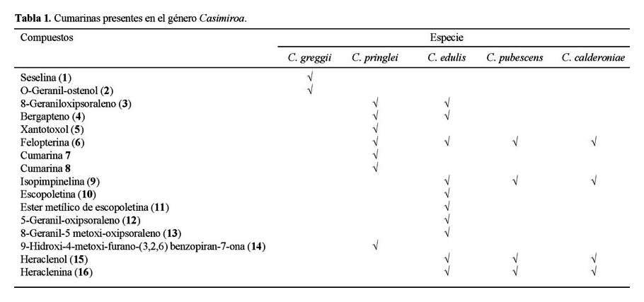 Hasta el momento, las cumarinas aisladas del género Casimiroa indican que tienen como precursor común a la umbeliferona, propuesta biogenética que es general a la familia Rutaceae (2). Sin embargo, tomando en cuenta nuestros resultados y lo reportado hasta el momento, existe una clara diferencia de la distribución entre las cumarinas sintetizadas por la C. greggii y las especies C. edulis, C. pringlei, C. pubescens y C. calderoniae.