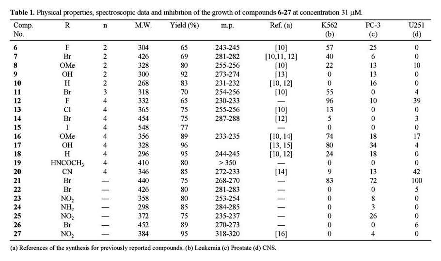The first series of compounds comprises N,N'-diarylalkanediamides with different numbers of methylenes in the aliphatic chain. The first compounds synthesized and probed were 6 to 10 (n = 2). These compounds displayed little activity in the three cell lines. The compound which inhibits cell growth to the greatest extent (57 % in K562) is 6 (R = F), followed by 7 (R = Br) in the same cell line.