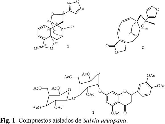2.98 kg de planta seca se sometieron a maceración con acetona, se evaporó el disolvente obteniendo 21.5 g de residuo acetónico. Se cromatografió en columna al vacío empacada con sílice en una proporción de 1 a 10 con respecto al peso del residuo obtenido. La elución se efectuó iniciando con hexano, y mezclas hexano-acetato de etilo de polaridad creciente, acetato de etilo y finalmente con mezclas acetato de etilo-metanol de polaridad creciente hasta un 20 % de metanol. La mezcla de los ácidos triterpénicos ursólico y oleanólicos se separó de las fracciones con polaridad 20-40 % de AcOEt. De la fracción obtenida con 50 % de AcOEt en hexano y por recristalización por par de disolventes con CH2Cl2 y éter (1:1), se purificó la salvifaricina (1). De las aguas madres de esta misma fracción y con recristalización por par de disolventes con CH2Cl2 y éter (1:1) se aisló la tonalensina (2). De la fracción obtenida con 25 % de hexano en AcOEt, mas los restos de la fracción anterior, se obtuvo la mezcla de los ácidos ursólico y oleanólico con un p.f. 225-228 °C. Finalmente, mediante la acetilación con anhídrido acético y piridina de la fracción de 20 % metanol en acetato de etilo, se obtuvo el derivado peracetilado de la luteolina 7-O-diglucósido (3).