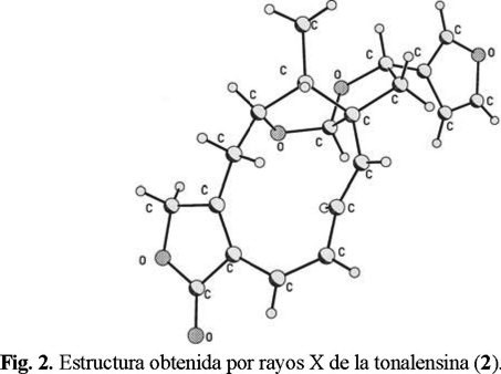 Tonalensina (2): p.f. 192-194 °C (lit. p.f. 191-193 °C [10]), IR (CHCl3) νmax cm−1: 1750, 1635, 1502, 1465, 1350, 1313, 1148, 1022, 946, 875. EM m/z (abundancia relativa) M+ 340 (73), 322 (13), 294 (42), 279 (22), 265 (24), 217 (59), 201 (54), 185 (50), 171 (45), 141 (42), 128 (54), 115 (53), 94 (100), 81 (78), 77 (53), 65 (33).