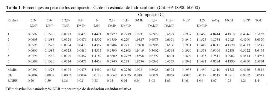Para hacer una adecuada evaluación de la composición del petróleo crudo, es indispensable contar con un método altamente preciso. Para ello, se realizó el análisis por sextuplicado de la mezcla comercial de hidrocarburos. La precisión del método cromatográfico utilizado fue determinada a través del porcentaje de desviación estándar relativa (% DER) de cada compuesto C7 (Tabla 1), obteniéndose valores menores de 1.5 % y satisfaciendo los criterios de calidad establecidos para métodos cromatográficos análogos [13].