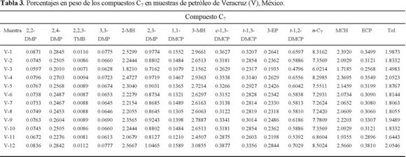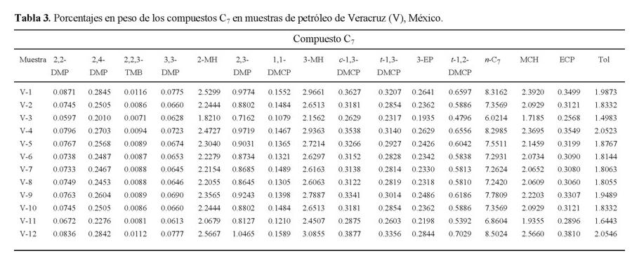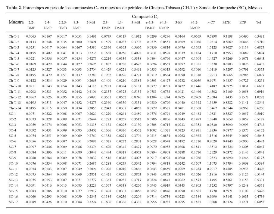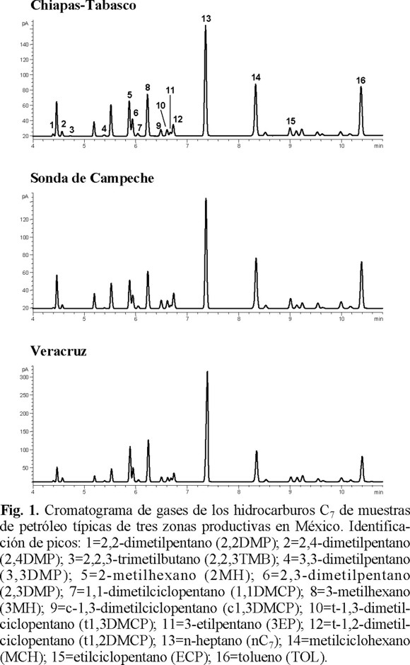 Método analítico. Las muestras de petróleo colectadas fueron analizadas por cromatografía de gases en un equipo Hewlett Packard 6890, Serie II, provisto con automuestreador y un detector de ionización de flama. Se empleó una columna PONA de 50 m de largo × 200 µm de diámetro interno, con 0.5 µm de espesor de película. Las condiciones analíticas son: temperatura del inyector: 300 °C, relación de split: 100:1 y temperatura del detector: 300 °C. Programa de temperatura del horno: iniciando a 35 °C por 5 min; primera rampa a 1.5 °C/min hasta 50 °C; segunda rampa a 8 °C/min hasta 300 °C por 20 min. El gas acarreador fue hidrógeno > 99.998 %, provisto de trampas para humedad, oxígeno e hidrocarburos. Se adicionó a la muestra 1-hexeno 99+ % (Aldrich) como estándar interno para la cuantificación y se consideró un factor de respuesta de 1. El volumen de inyección fue igual a 0.5 L y se utilizó CS2 99.9+ % (Aldrich) como solvente para el lavado de jeringa. La asignación del los compuestos C7 se hizo con base en un cromatograma de referencia proporcionado por el proveedor con la mezcla comercial de hidrocarburos parafínicos, naftenos y aromáticos (Cat. HP 18900-60600).