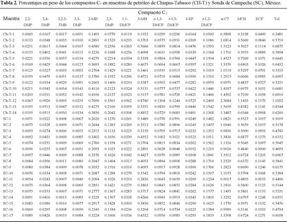 Conforme a la metodología de Thompson, los aceites crudos de Veracruz claramente se distinguen del resto y forman un grupo de aceites muy maduros, lo que es congruente con la información geoquímica previa [11] (Fig. 2). Sin embargo, los aceites de Chiapas-Tabasco y de la Sonda de Campeche son clasificados en un solo grupo (lo que sabemos de antemano que es incorrecto) con similar grado de madurez y eventualmente lavados por agua.