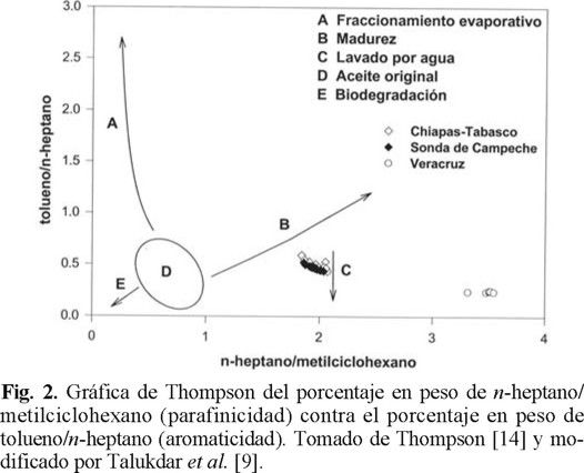 La metodología propuesta por Thompson se basa en la evidencia de que la fracción ligera de algunos aceites contienen concentraciones muy altas de compuestos aromáticos y nafténicos, mientras que la proporción de compuestos a base de n-alcanos es baja [14]. Así, se definen los términos aromaticidad (Tolueno/n-C7), que se relaciona con el fraccionamiento evaporativo, y parafinicidad (n-C7/metilciclo-hexano), un valor que se incrementa con la madurez del aceite. El diagrama propuesto por Thompson permite clasificar los aceites crudos y condensados de acuerdo al tipo de alteración: fraccionamiento evaporativo, madurez, lavado por agua y biodegradación.