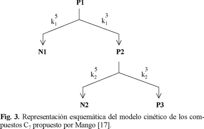 Adicionalmente, Mango propone dos gráficas complementarias para clasificar aceites: P3 contra (P2+N2) y P2 contra N2/P3 que se relacionan con la fuente generadora y que se basan en el estudio sobre la formación de los isómeros C7 [16,17]. Postula que el mecanismo de formación de los isómeros C7 procede a través de un modelo cinético de compuesto padre P a compuesto hijo N (Fig. 3), definiendo: P1 = heptano; P2 = 2-metilhexano + 3-metilhexano; P3 = 2,2-dimetilpentano + 2,4-dimetilpentano + 2,3-dimetilpentano + 3,3-dimetilpentano + 3-etilpentano; N1 = etilciclopentano + 1,2-dimetilciclopentano (cis + trans); N2 = 1,1-dimetilciclopentano + 1,3-dimetilciclopentano (cis + trans) [15-17]. En el modelo cinético, los subíndices de las constantes de velocidad representan los padres (P1 y P2) y los superíndices denotan el número de átomos de carbono involucrados en la etapa intermedia de formación del anillo para generar el producto. El compuesto padre P1 puede rearreglarse en una simple etapa en las estructuras P2 y N1 pero no a las estructuras P3 y N2. Los productos en N1, N2 y P3 se consideran productos finales que no proceden a otro rearreglo posterior. Adicionalmente, los productos N2 y P3 obtenidos a partir de P2 guardan una proporción constante en la composición del aceite crudo ya que la constante de velocidad k2 es muy semejante para ambos. Por lo tanto, el criterio de agrupamiento se basa en que los metilhexanos en P2, los dimetilpentanos en P3 y los dimetilciclopentanos en N2 son variables dependientes del tipo de materia orgánica presente en la fuente generadora del petróleo; por lo que, permanecen constantes para una serie homóloga de aceites [16,17]. En el caso de la segunda gráfica de origen, el criterio establecido por Mango consiste en que N2 y P3 son productos generados a partir de P2, por lo cual, independientemente de la madurez, su relación debe ser muy similar para una serie homóloga de aceites [5,16,17].