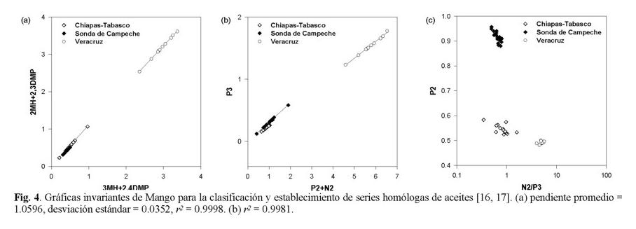 Al analizar la gráfica 2MH+2,3DMP contra 3MH+2, 4DMP generada con los datos de los aceites estudiados en el presente trabajo, se observa claramente que todas las muestras presentan valor cercano a la unidad en el parámetro de invarianza (Fig. 4a), lo cual impide su diferenciación. No obstante, es importante destacar que las muestras de la Cuenca de Veracruz se ubican en una zona de la gráfica con valores altos de la relación 3MH+2,4DMP, diferente a las muestras restantes.