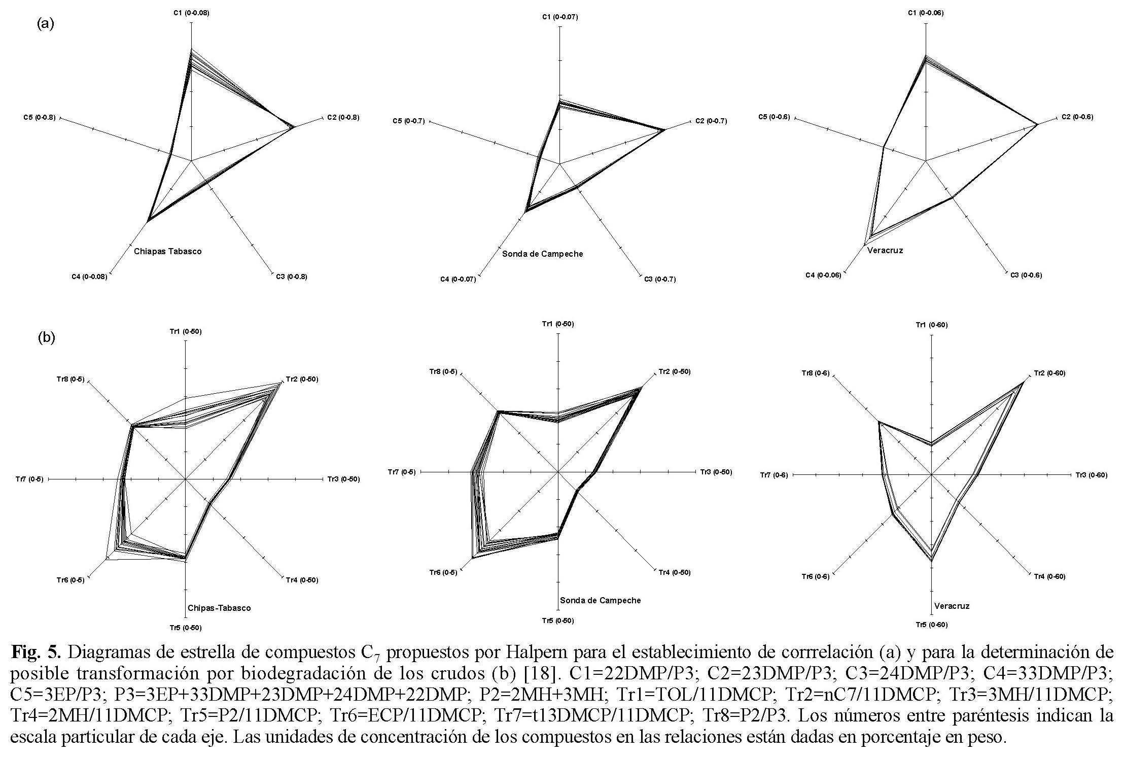 El diagrama de estrella para la correlación de aceites con base en compuestos C7 de Halpern, exhibe un perfil muy parecido para los tres grupos, aunque los aceites de Veracruz presentan un perfil proporcionalmente mayor (Fig. 5a). De la misma manera, los perfiles de los aceites de Chiapas-Tabasco y Sonda de Campeche son muy similares en el diagrama de transformación (Fig. 5b); no obstante, esta representación permite diferenciar el grupo de aceites de Veracruz (Fig. 5b).