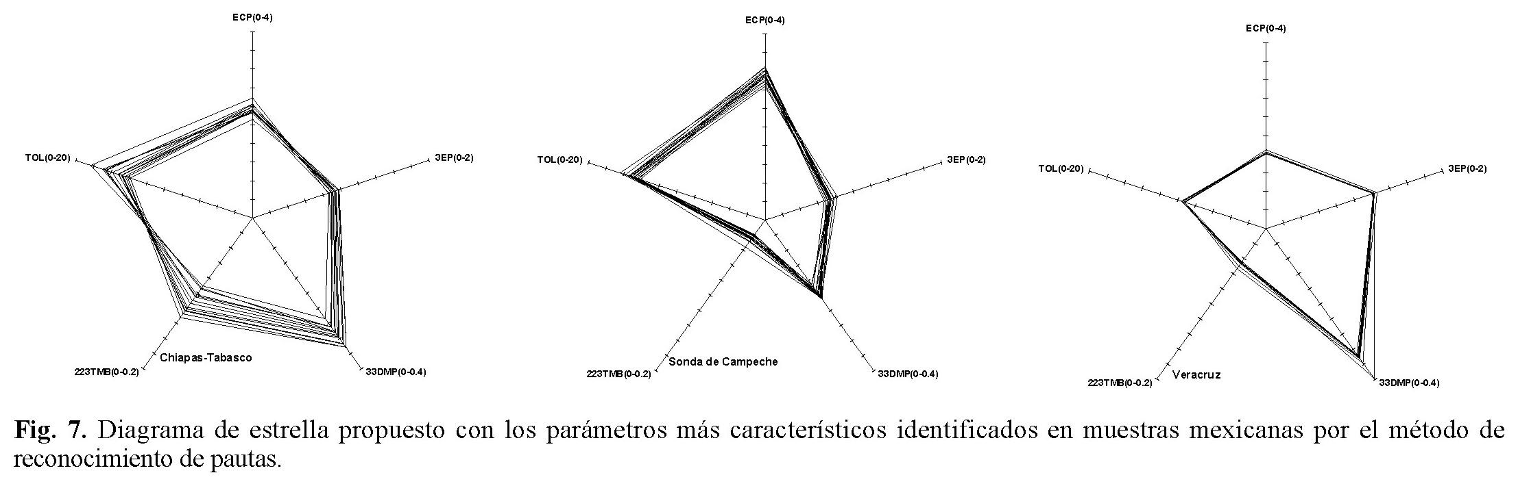 Así, la clasificación obtenida a partir del análisis de componentes principales es excelente, coincidiendo con la propia naturaleza y origen de los crudos reportada anteriormente (Fig. 6a) [11]. Los dos componentes principales más importantes explican el 93.9 % de la varianza. Si observamos la gráfica de cargas, los parámetros que tienen la mayor influencia sobre la clasificación son: ECP, 3EP, 3,3DMP, 2,2,3TMB y TOL, en orden decreciente de importancia (Fig. 6b). En otras palabras, estos compuestos C7 son los principales responsables de la clasificación de los aceites. Como consecuencia de lo anterior, se propone utilizar un diagrama de estrella con estos 5 compuestos a fin de identificar visualmente y de manera sencilla, los perfiles de cada grupo (Fig. 7). El nuevo diagrama propuesto, claramente muestra diferencias importantes entre las tres familias, por lo que debe considerarse una mejor opción a los establecidos previamente en la literatura. Es importante destacar que entre los 5 compuestos más característicos de las muestras mexicanas, dos de ellos no son utilizados por la metodología tradicional (2,2,3TMB y ECP).