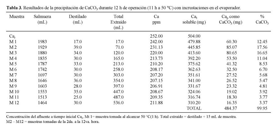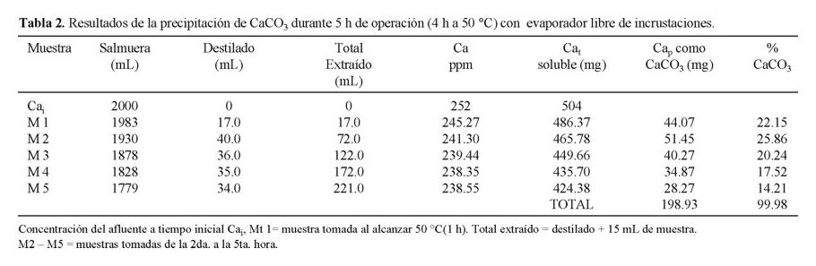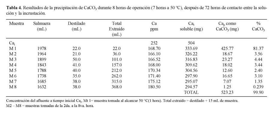 Cuando el evaporador está libre de incrustaciones (experimento 1, Tabla 2), la cantidad total precipitada como carbonato de calcio es de 198.93 mg, de los cuales, el 22.15 %, se forma al alcanzar la temperatura de trabajo (50 °C), es decir, en la primera hora de tratamiento térmico. A la segunda hora de operación se alcanza el 48 % de la reacción. Como se observa, la mayor cantidad de precipitado se presenta en las dos primeras horas de operación. Al término del experimento, el 15.78 % de los iones totales de calcio reaccionaron.