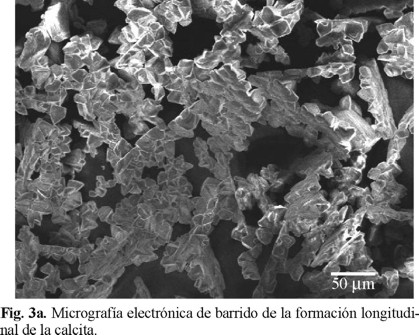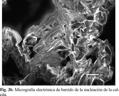 En la Fig. 3a se muestra la micrografía de una muestra de los cristales de calcita depositados sobre la salmuera. En ésta se muestra el crecimiento cristalino en dirección longitudinal. En la micrografía de la Fig. 3b se observa con mayor acercamiento la nucleación de los mismos cristales formados. En los tres experimentos se observó la misma morfología de los cristales. Asimismo, una observación a los cristales en las primeras etapas de la precipitación, mostró la misma morfología y dimensiones de la calcita.