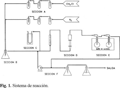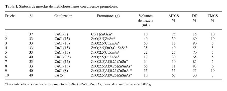 El silicio empleado fue adquirido de la Compañía "Metales Aguila" (98.5% en peso) y fue molido a −300 mallas cuidando de no contaminarlo durante la molienda y clasificación. Los reactivos utilizados tales como óxido de zinc, óxido de estaño, zinc, estaño, cobre, cloruro cuproso y trióxido de arsénico adquiridos de Backer. El cloruro de metilo usado (99.5% en pureza) fue adquirido de Air Products and Chemicals, Inc. y el nitrógeno gaseoso de INFRA. Todas las reacciones cuyos resultados se reportan en la tabla 1, fueron efectuadas en un reactor de acero inoxidable de 2.5 cm de diámetro interno y 30 cm de longitud, provisto de un cabezal para retorno de finos unido con una brida al tubo de acero inoxidable.