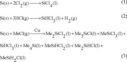 Si bien existe una gran cantidad de información publicada y patentada relacionada con esta reacción, muchos de sus aspectos fundamentales continúan estudiándose y las experiencias industriales así como muchos de sus fundamentos científicos empezaron a ser compartidas hasta inicios de la década de los noventas. Diversos enfoques sobre la reacción directa desde el punto de vista científico e industrial fueron recopilados por primera vez en un texto editado por Lewis y Rethwisch [6]. De estas experiencias y análisis de la reacción directa, se conoce que la etapa clave de la reacción es la inicial e involucra la activación del silicio, proceso que se define como la incorporación al silicio del catalizador de cobre, de diversos promotores tales como zinc y estaño entre otros, al igual que de activadores, usados estos últimos en cantidades ínfimas que de acuerdo a distintas experiencias, no se puede hablar de un porcentaje específico, mas sin embargo tienen influencia en la reacción. La activación puede realizarse in situ en el mismo reactor, o bien efectuarse en una unidad diferente de la que luego habrá que transportar el silicio al reactor bajo atmósfera de nitrógeno. En ambos casos, el silicio se mezcla con el catalizador de cobre y con los diversos promotores, entre los que destacan estaño y zinc, a una temperatura de 300 °C y bajo flujo del gas inerte. A la combinación entre el silicio, el catalizador de cobre y los promotores, se le denomina masa de contacto. La preparación eficiente de esta masa de contacto, se puede realizar mezclando íntimamente el silicio en polvo con el catalizador de cobre y con los promotores, para posteriormente calentarla bajo flujo del gas inerte a la temperatura indicada. Uno de los catalizadores utilizados es el cloruro cuproso, el cual durante la activación, se reduce a cobre metálico con desprendimiento de tetracloruro de silicio gaseoso. El cobre que se produce, se encuentra en un estado muy activo y forma una película muy delgada sobre la superficie del silicio conjuntamente con la formación de una aleación, la que se considera que es la forma catalíticamente activa del cobre. Se ha argumentado que casi todo el cobre formado se transforma en un compuesto intermetálico, conocido como la fase h [7]. Finalmente, la masa de contacto se hace reaccionar con cloruro de metilo el cuál paulatinamente sustituye a la corriente de gas inerte. La temperatura de la reacción normalmente se mantiene en 300 °C. En los laboratorios y en la industria el tipo de reactores usados han sido reactores de lecho fijo o fluidizado. Los estudios sobre el efecto de los promotores en la cinética de la reacción, es un tema que se mantiene en el interés de distintos grupos que investigan el tema [8].