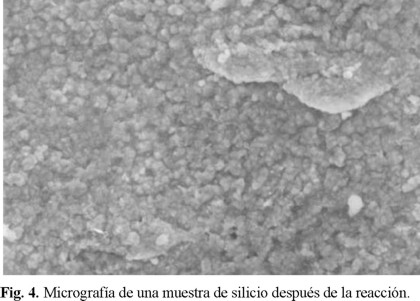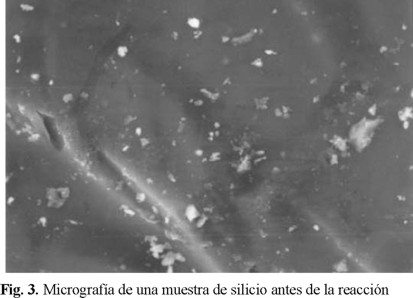 Las figuras 3 y 4 ilustran micrografías obtenidas en el microscopio electrónico de barrido de muestras de silicio antes y después de la reacción con cloruro de metilo. En la figura 4 se muestra claramente la alteración de la superficie como resultado de la reacción.