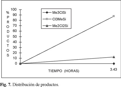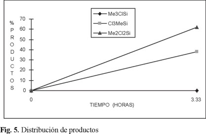 Identificación de productos. La identificación de los productos se realizó por RMN de 1H en un espectrómetro Varian Gemini de 200 MHz y en un cromatógrafo de gases Intermast IGC 112M con detector de conductividad térmica equipado con un registrador-integrador Perkin-Elmer LS100. La columna utilizada fue una OV-210 en cromosorb PHP 80/100, con temperaturas del inyector de 120 °C, horno 95 °C y detector 160 °C. El gas acarreador fue helio con un gasto de 30 mL/min. Con el fin de estudiar las modificaciones en la superficie del silicio como resultado de la reacción entre la masa de contacto con el cloruro de metilo, se recurrió al estudio por microscopía electrónica de barrido de algunas muestras de silicio antes y despues de la reacción. El equipo utilizado fue un microscopio electrónico de barrido marca JEOL modelo JSM-35C. El registro de la temperatura en el reactor durante la activación y posteriormente en la reacción, se efectuó con un registrador modular de temperatura Cole-Palmer modelo 2030. El análisis en porcentaje en peso obtenido por cromatografía de gases de las mezclas de metilclorosilanos obtenidos fue limitado exclusivamente a metiltriclorosilano (MeSiCl3, MTS), dimetildiclorosilano (Me2SiCl2, DD) y trimetilclorosilano (Me3SiCl, TMCS), ya que son los que se obtienen en mayor porcentaje en la reacción directa. En la identificación de los productos realizada por RMN de 1H, los desplazamientos químicos de los productos indicados fueron referidos a tetrametilsilano (Me4Si, TMS, 0 ppm). Todos los espectros fueron obtenidos usando cloroformo deuterado como disolvente.